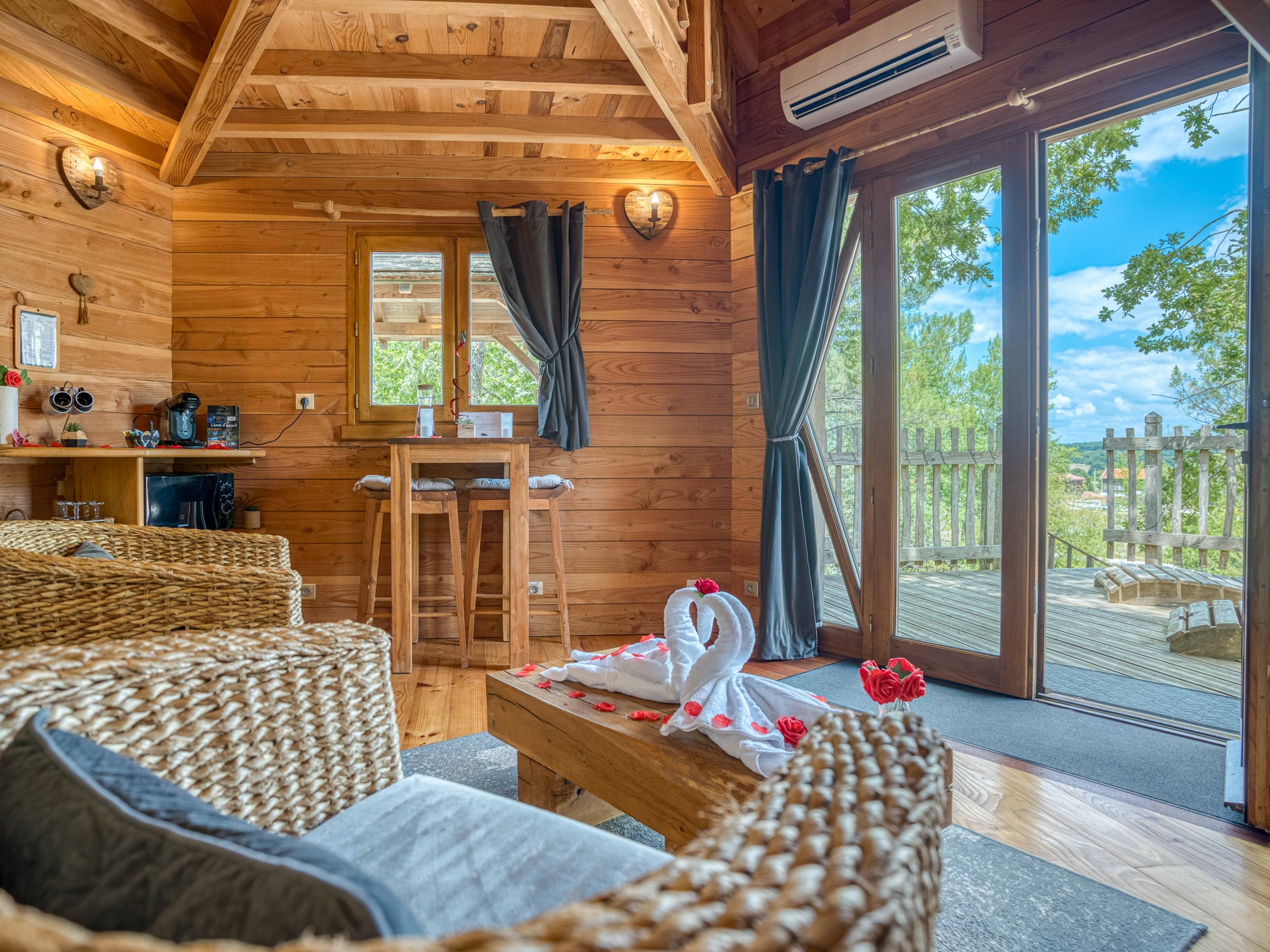 Pour vous garantir un séjour reposant et confortable, le petit déjeuner est servi dans votre cabane perchée, et draps et serviettes de bains sont fournis. Nos cabanes dans les arbres sont toutes chauffées et bénéficient d'une isolation performante, avec de larges ouvertures double vitrage.