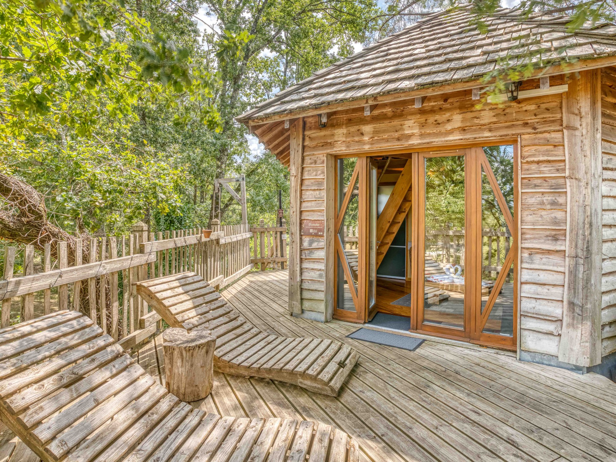 À proximité du plus grand lac du domaine, entrez dans l'ambiance feutrée de la cabane perchée "Domme", l'écrin des amoureux.